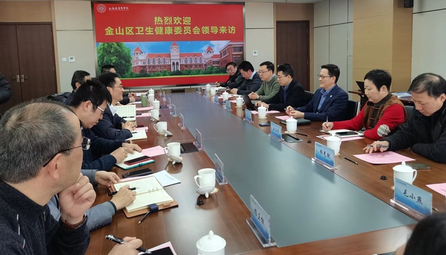 2023年12月20日,金山区卫生健康委员会副主任周永辉带队金山区中心医院副院长殷俊、朱泾社区卫生服务中心主任杨旦红等一行来访我校。我校副校长汤磊,职能部门及学院的相关负责人参加座谈。会议由产学合作处处长张苏华主持。