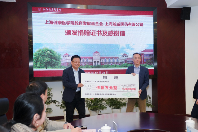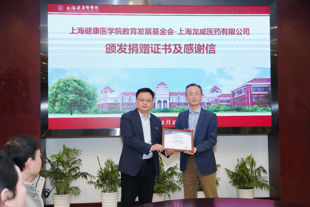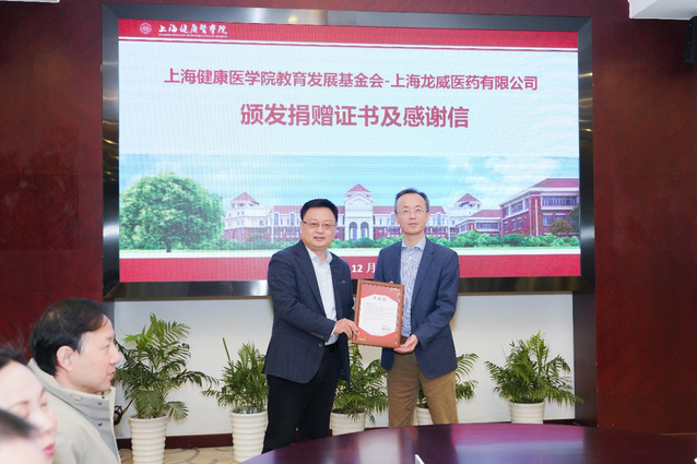 12月23日上午,上海龙威医药有限公司(以下简称“龙威医药”)-上海健康医学院教育发展基金会捐赠仪式在108会议室举行。上海龙威医药有限公司总经理王伟祥,学校党委副书记、副校长唐红梅,校党委常委、宣传部部长、基金会理事长李兆伟,基金会秘书长王红及学校相关部门负责人出席。