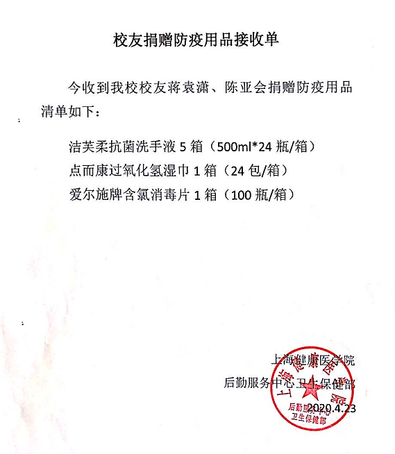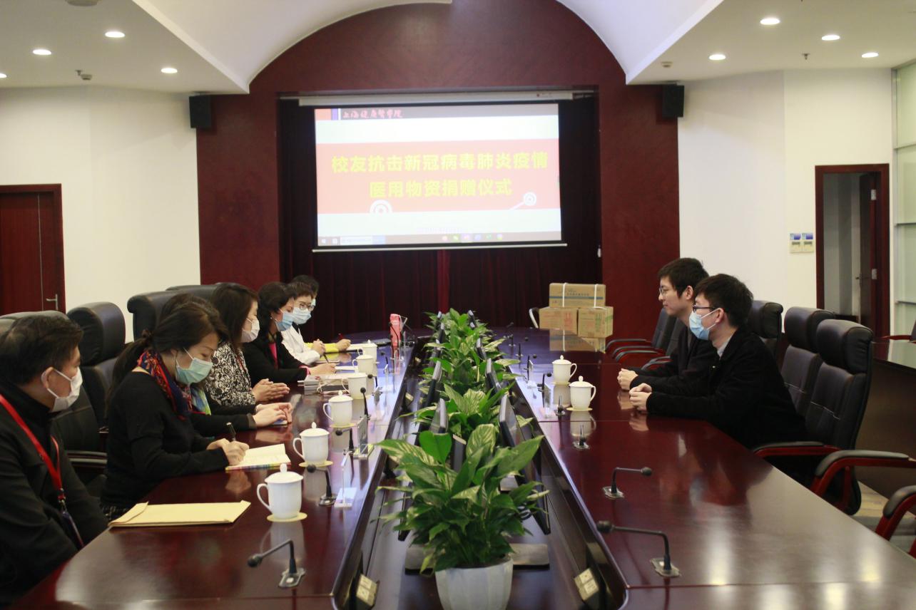 4月23日,在学校北苑108会议室举行了一场简朴的“校友抗击新冠肺炎医用物资捐赠仪式”。学校后勤服务中心主任、疫情防控办副主任张美蓉,教务处副处长蒋淑敏,医疗器械学院副院长张欣、办公室主任施守仁等参加会议,校友工作办公室副主任王红主持会议。